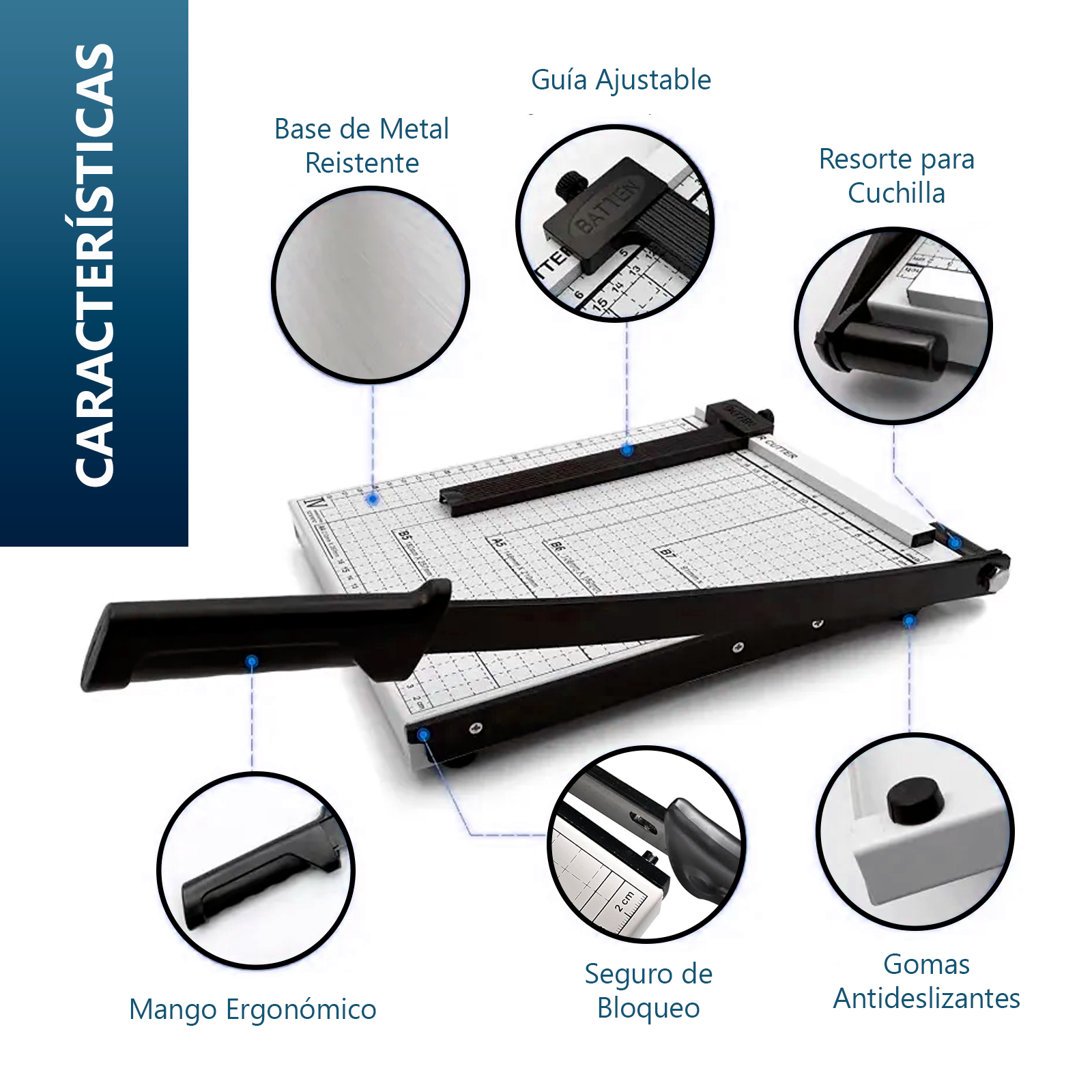 - 🛡️ Protección al usuario: Riel protector para dedos, pestillo de seguridad y base antideslizante con 4 almohadillas de esponja.ortar máximo 10 hojas.
