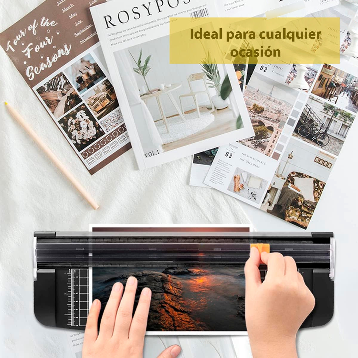 Es capaz de cortar cualquier tipo de papel que no exceda el grosor de 10 hojas de papel blanco como: